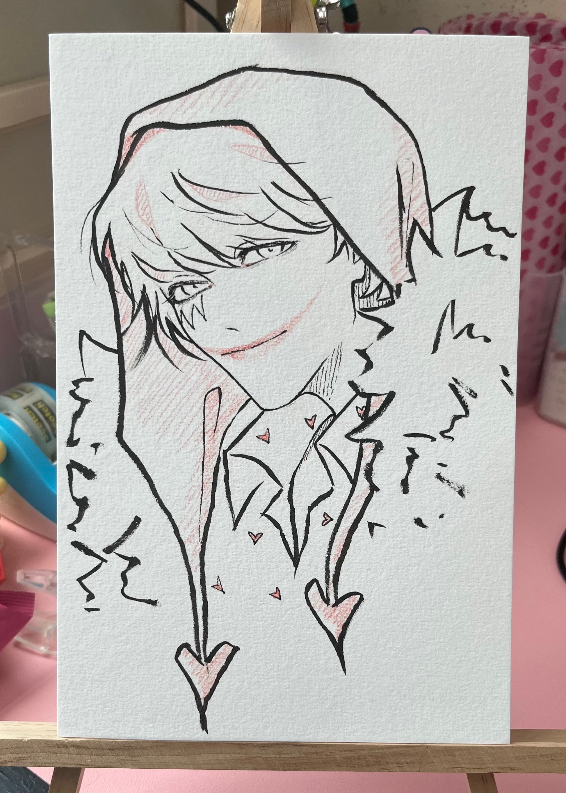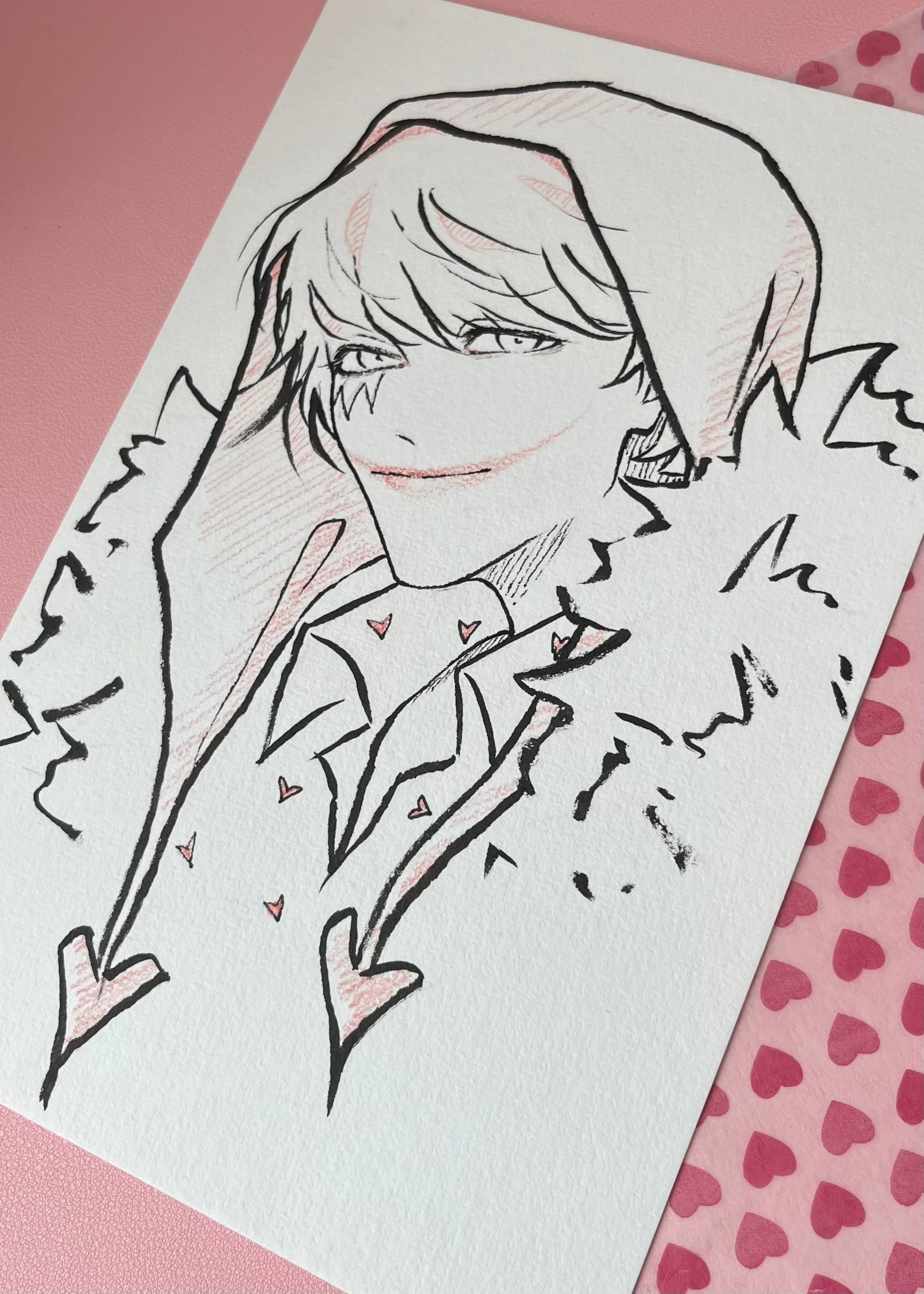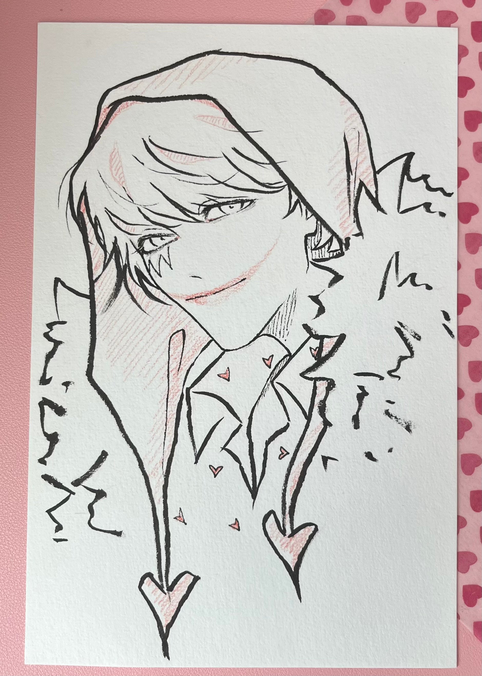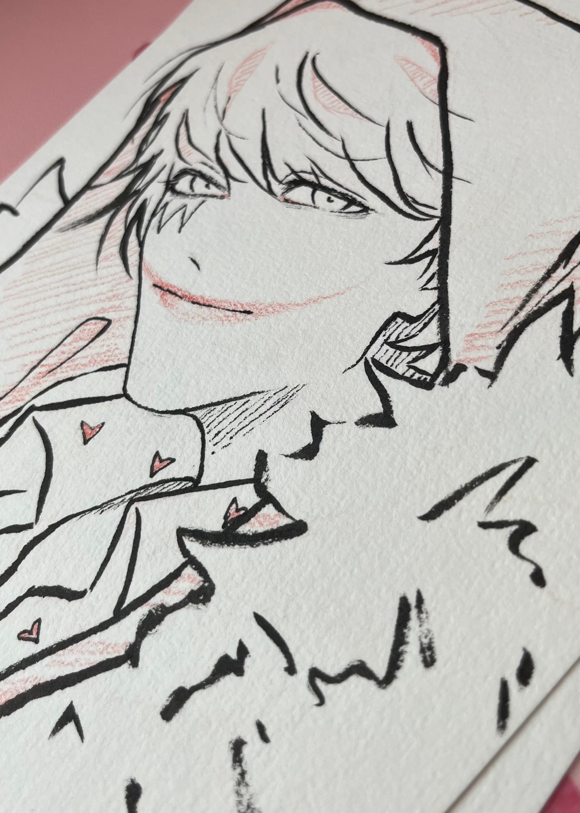This listing is for a 6 x 9 inch original artwork by Hkdoodles (Hiba)!! Featuring best (looking lol) dad Corazon, it is an ink & colored pencil piece done on 100% cotton 300gsm paper and, If you're the first to snatch this, you will be the owner of a one of a kind piece!
